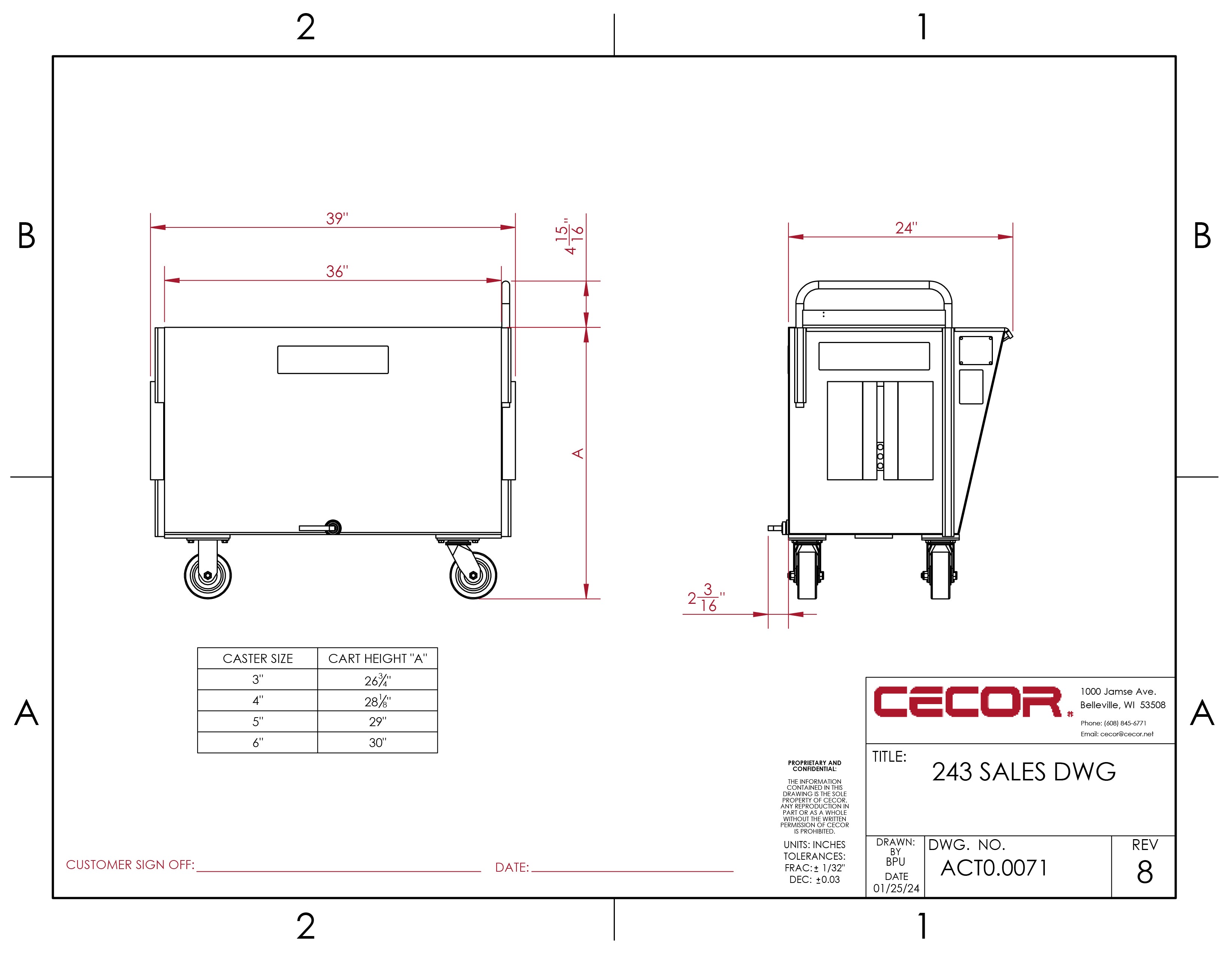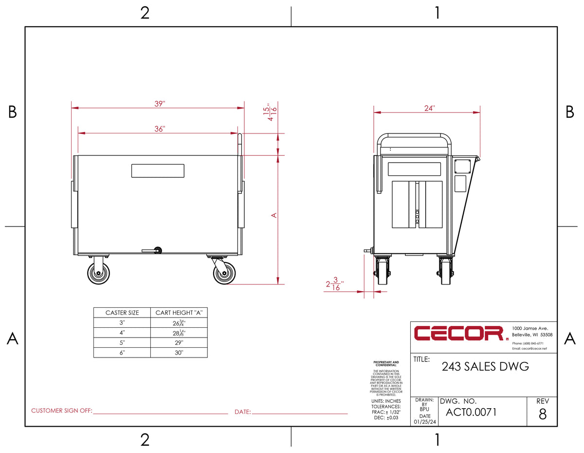 Our intelligent design maximizes cube capacity while minimizing footprint, preserving valuable floor space. With a 29” lip height and a robust 1,500 lbs of capacity, this cart is perfectly suited for fitting under machine tool conveyors. Experience unparalleled efficiency and versatility with CECOR's Smart Design Cart.